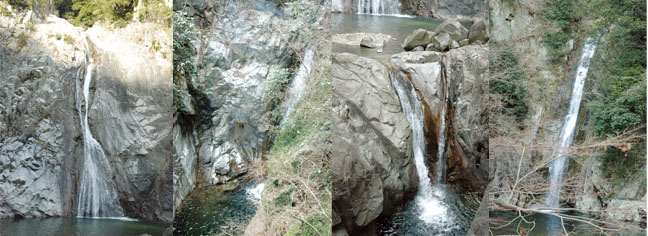 (写真左から)布引の滝、鼓ヶ滝、夫婦滝、雌滝